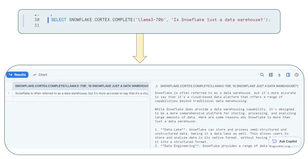 SELECT SNOWFLAKE.CORTEX.COMPLETE('llama3-70b', 'Snowflake 不只是一个数据仓库吧?');