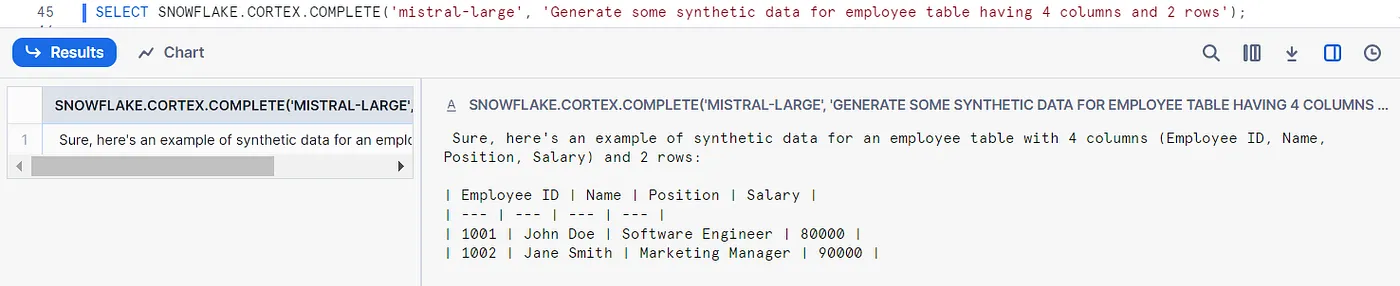 SELECT SNOWFLAKE.CORTEX.COMPLETE('mistral-large', '生成一些用于员工表的合成数据,该表有4列2行');