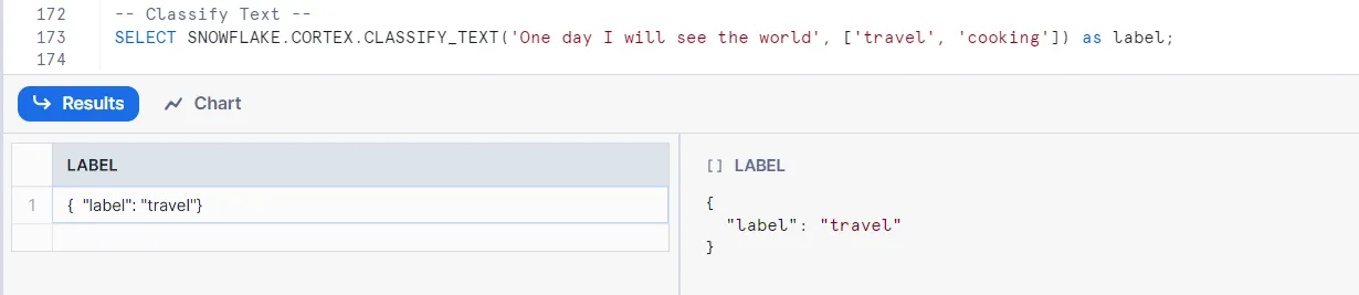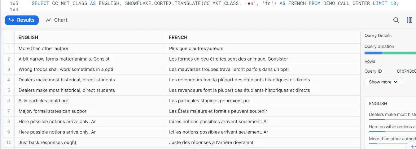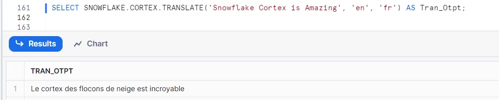 SELECT SNOWFLAKE.CORTEX.TRANSLATE('Snowflake Cortex 很神奇', 'en', 'fr') AS Tran_Otpt;