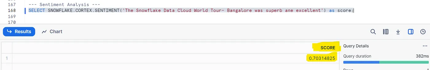 SELECT SNOWFLAKE.CORTEX.SENTIMENT('《Snowflake 数据云世界巡回- Bangalore》非常好和非常棒') as score;