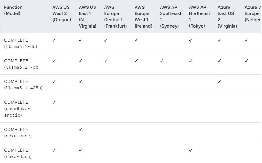 Cortex功能的可用情况:大家都知道,Snowflake作为SaaS可以在所有云服务提供商和大多数区域中使用。因此,能否使用Cortex功能取决于它在各个区域和云提供商中的可用情况。下图(图片来源Snowflake)显示了可用的位置。