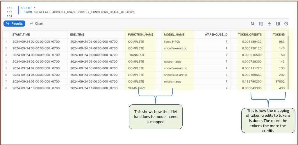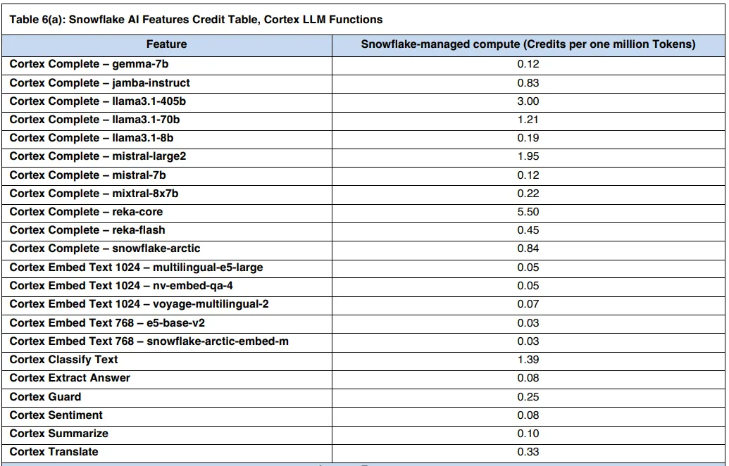 概括来说,我们可以看到成本与处理的 token 数量越多成比例。附上来自 Snowflake 的关于信用与 token 映射的代码片段。