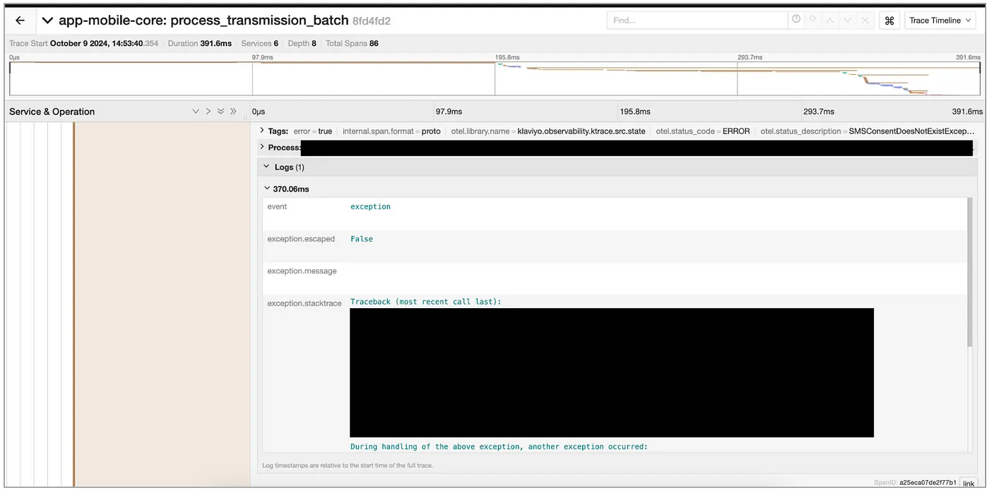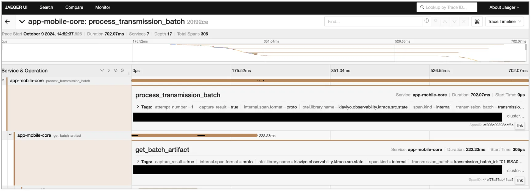 凭借这些改进,我们现在可以在不到一分钟的时间内访问与发送特定短信相关的Jaeger追踪。我们可以迅速确定总执行时间,并自信地告知客户延迟是否源自我们的系统或其他地方。这种效率与原来回答同样问题需要数小时形成了鲜明对比!