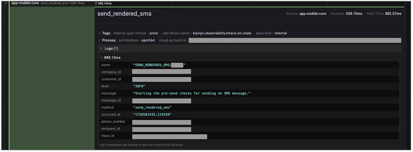 我们在关联日志和事件时遇到了一些挑战,这些日志和事件在一个系统中使用特定标识符记录,但当这些事件跨越不同系统时,这些标识符往往无法一致地传递下去。例如,一个系统用 batch_id 标识一批特定的短信,而另一个系统则会用 transmission_id 记录相同的批次,但不会留下 batch_id 的记录。