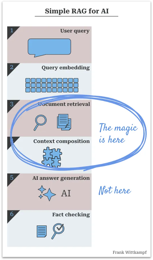 其实最不光彩的秘密是,RAG过程的本质是检索和生成(Retrieval and Generation),你必须在AI采取任何行动之前给出答案,这样它才能给出你想要的答案。