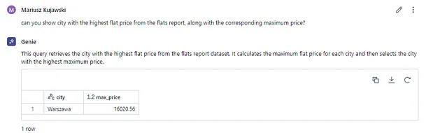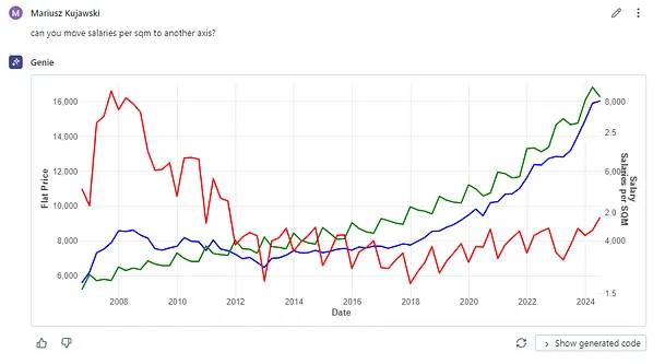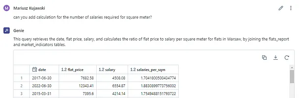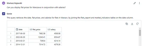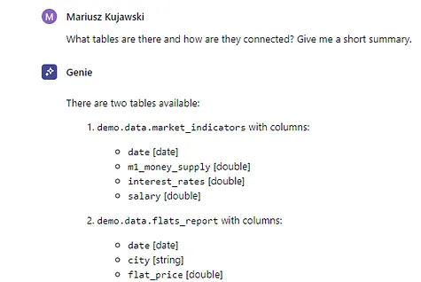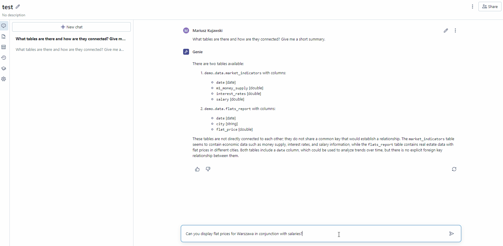 为了测试的目的,我准备了包含波兰公寓价格的数据表格,还包含了M1货币供应量、利率和工资等额外指标。要检查工作空间中有哪些表格,我们只需要问一下Genie就行了。