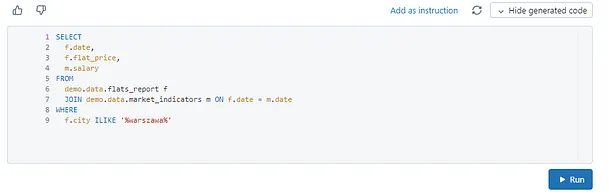 真是太厉害了,Genie 能自动连接表,并选择合适的列来连接表。查看 AI 生成的查询,确保结果准确。点击“显示生成代码”按钮,我们就可以看到 Genie 使用的查询。