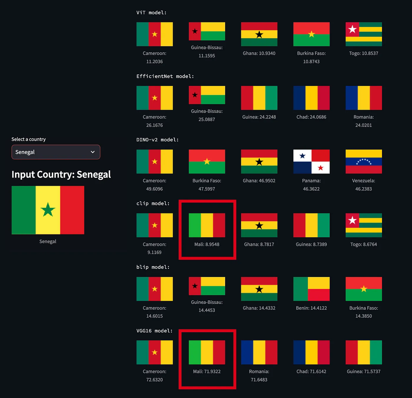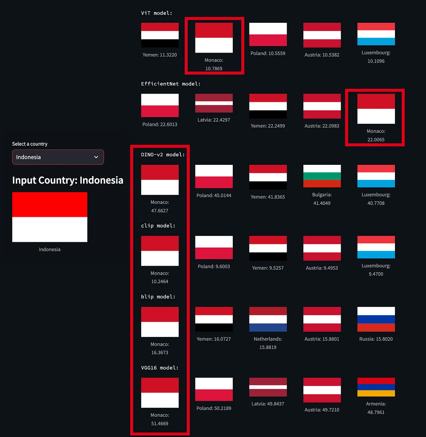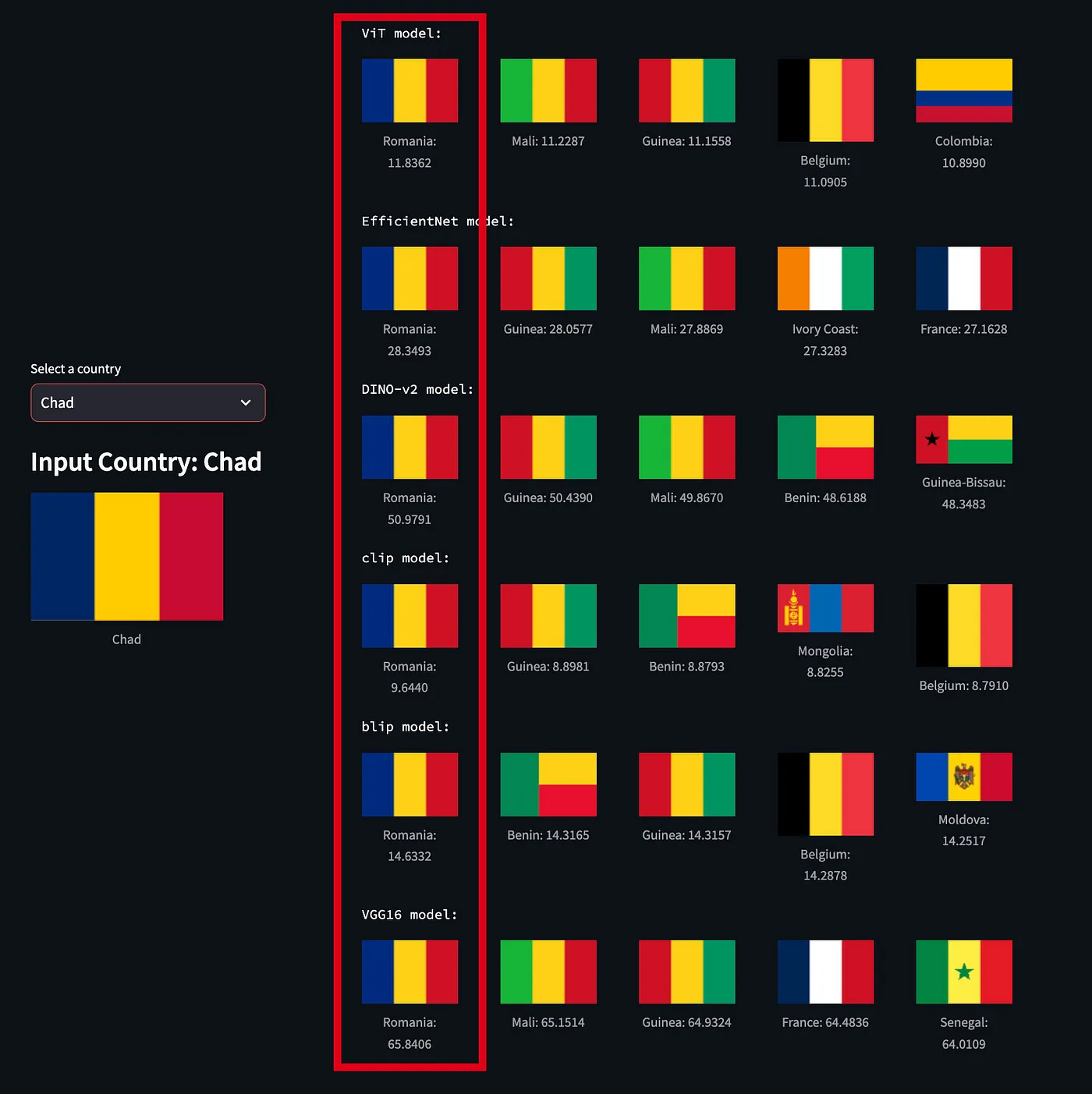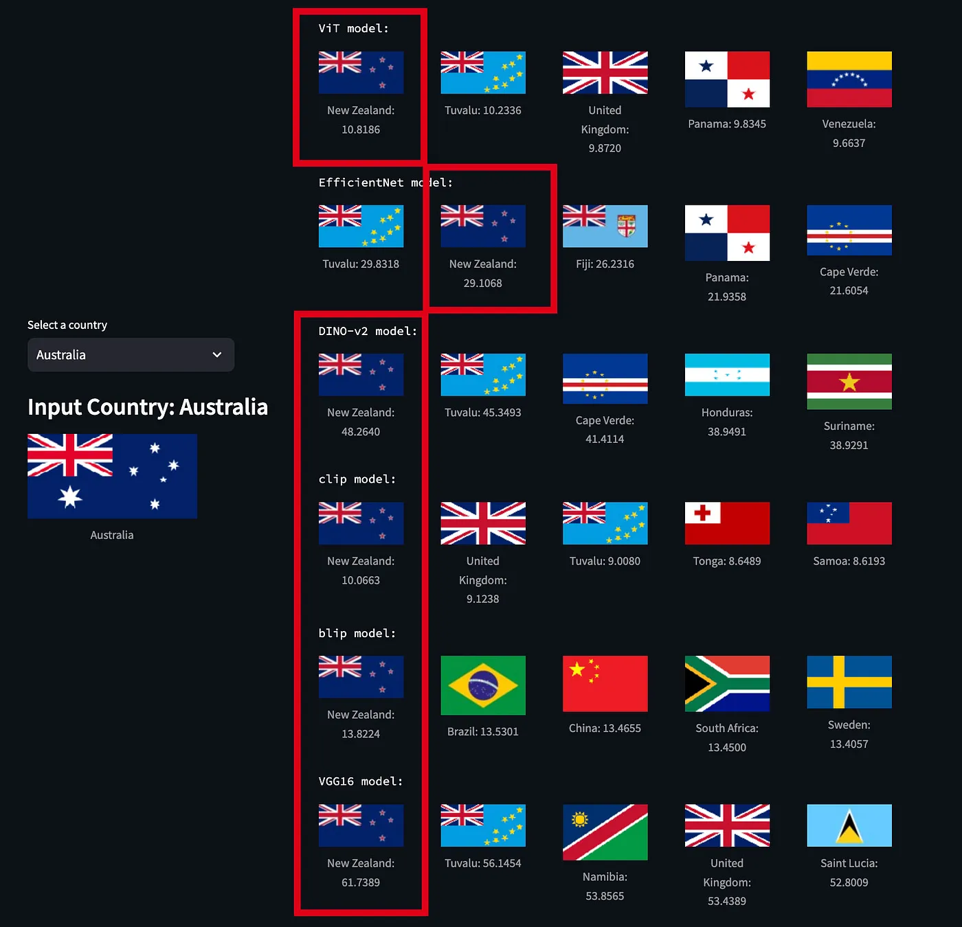 为了试一下,我将同一套旗帜图片输入所有模型,并比较了它们的推荐结果。结果如下: