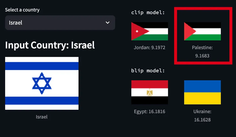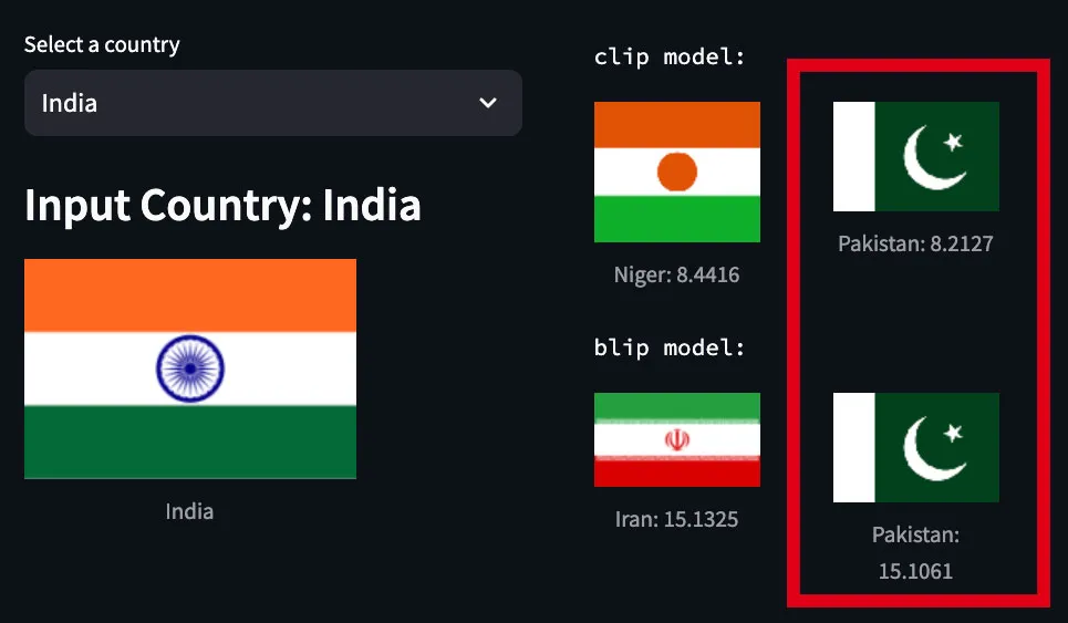 小心:相似模型中的上下文偏倚某些模型,如CLIP,可能会无意中根据上下文关系而非视觉相似性来分组国家。例如,印度和巴基斯坦可能在相似性搜索中被置于接近的位置,不是因为它们国旗的设计相似,而是因为它们的地缘政治联系以及在国际新闻和讨论中经常被一同提及。同样,模型可能会将以色列和巴勒斯坦以及乌克兰和俄罗斯分组在一起,尽管它们的国旗差异很大,因为这些国家在政治话语、媒体报道和历史背景中经常被联系起来。