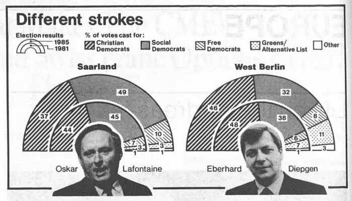 1985年3月16日《经济学人》档案中的手绘半饼图(Douglas,2018年[2]重新发布)。该图使用条纹、圆点等图案而不是用颜色区分各类别。