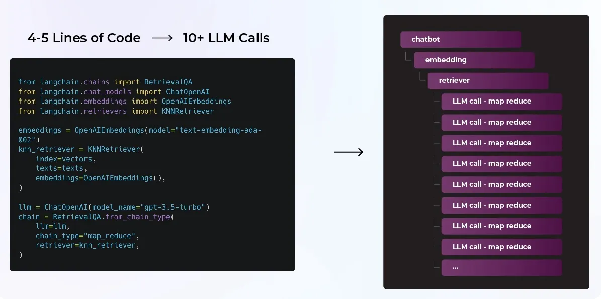 这种复杂性通常被代码的抽象层所隐藏,只有在出现问题时才会变得明显。一行代码可能会触发一系列连锁反应的调用(跨度)。每个跨度都需要进行不同的评估,从而导致你的问题变得更加复杂。例如,下面这个简单的代码片段会触发多个LLM调用。