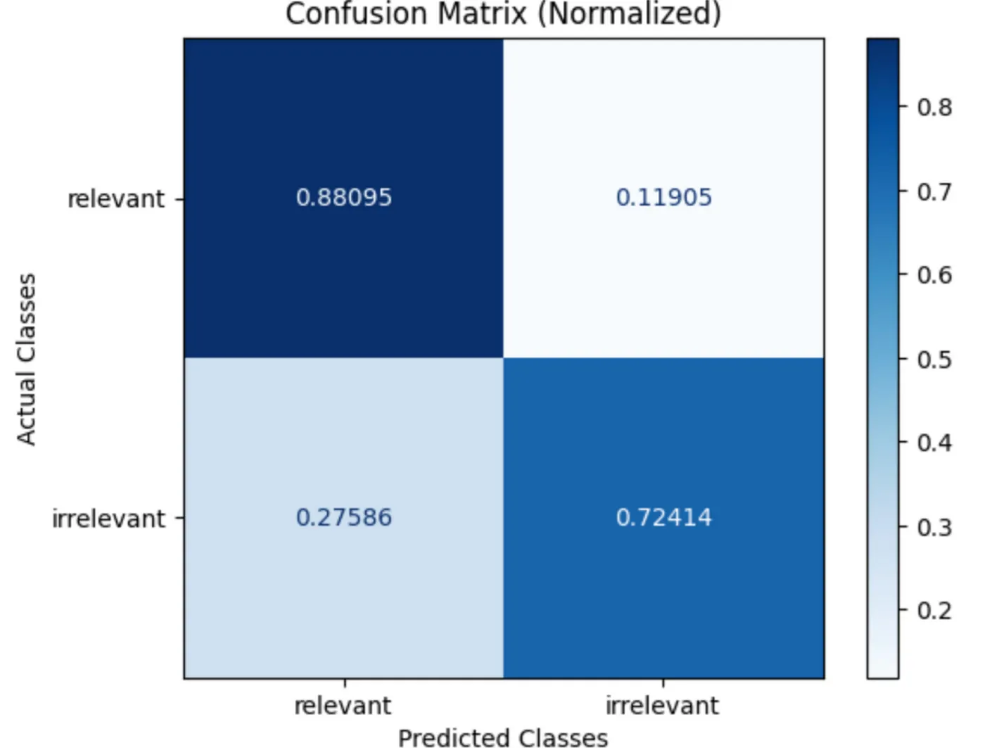 图表由作者绘制 | 在此示例中,我们看到正确预测的比例最高,这个比例达到88%:标准数据集中相关示例有88%的概率被正确标记。然而,我们发现评估在处理“不相关”示例时,表现不如处理“相关”示例时好,误标记的比例超过27%,即有超过27%的“不相关”示例被误标记为“相关”。