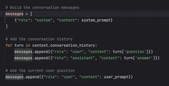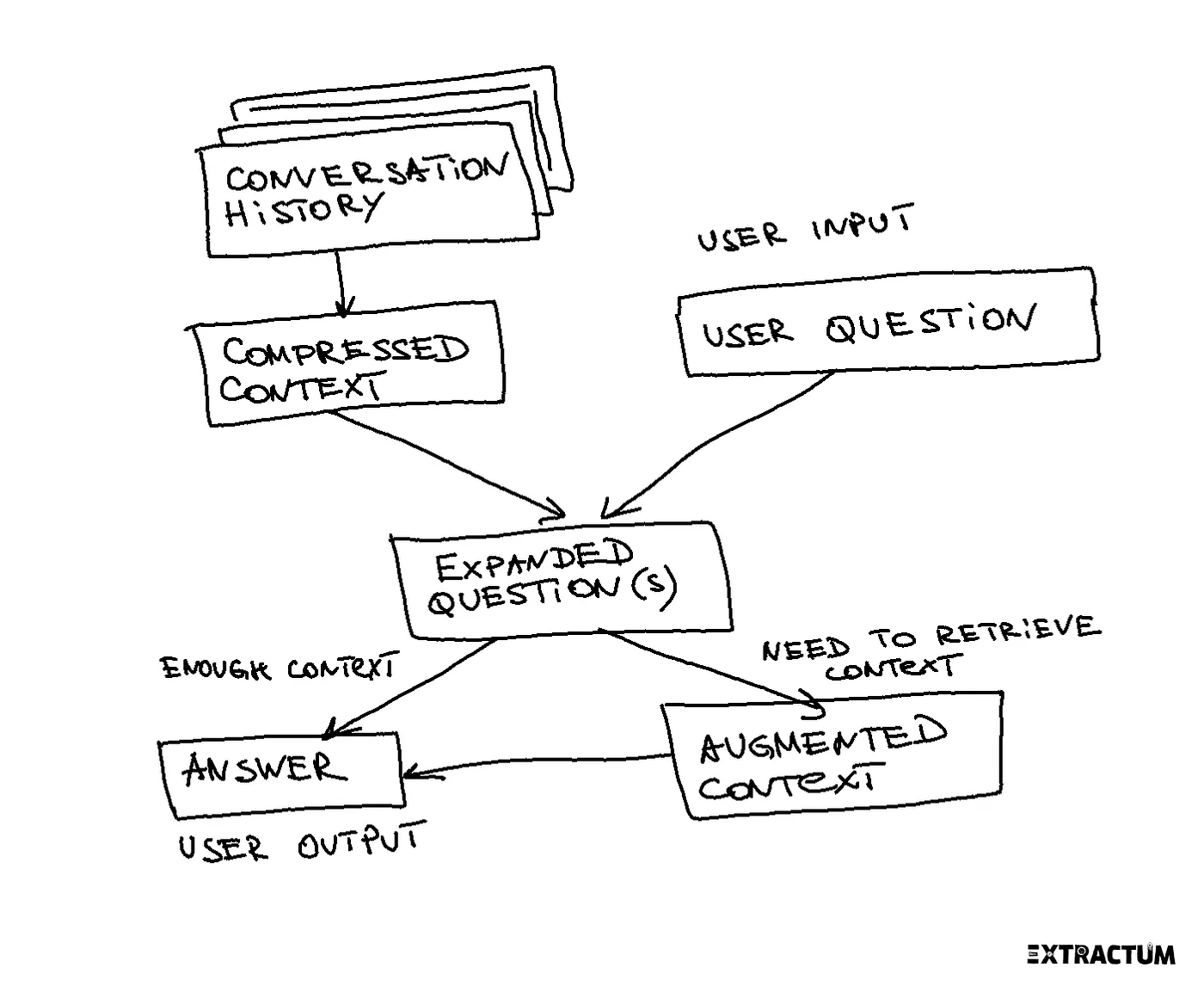 - 如果问题带有对话历史,我会提取最后N个问答对,这些问答对适合给定的上下文大小,但不超过5个最近的问答对(这在大多数情况下已经足够了)。这允许我根据每个答案的长度动态调整考虑的历史大小,在保持令牌经济的同时纳入最近最多的问答对。