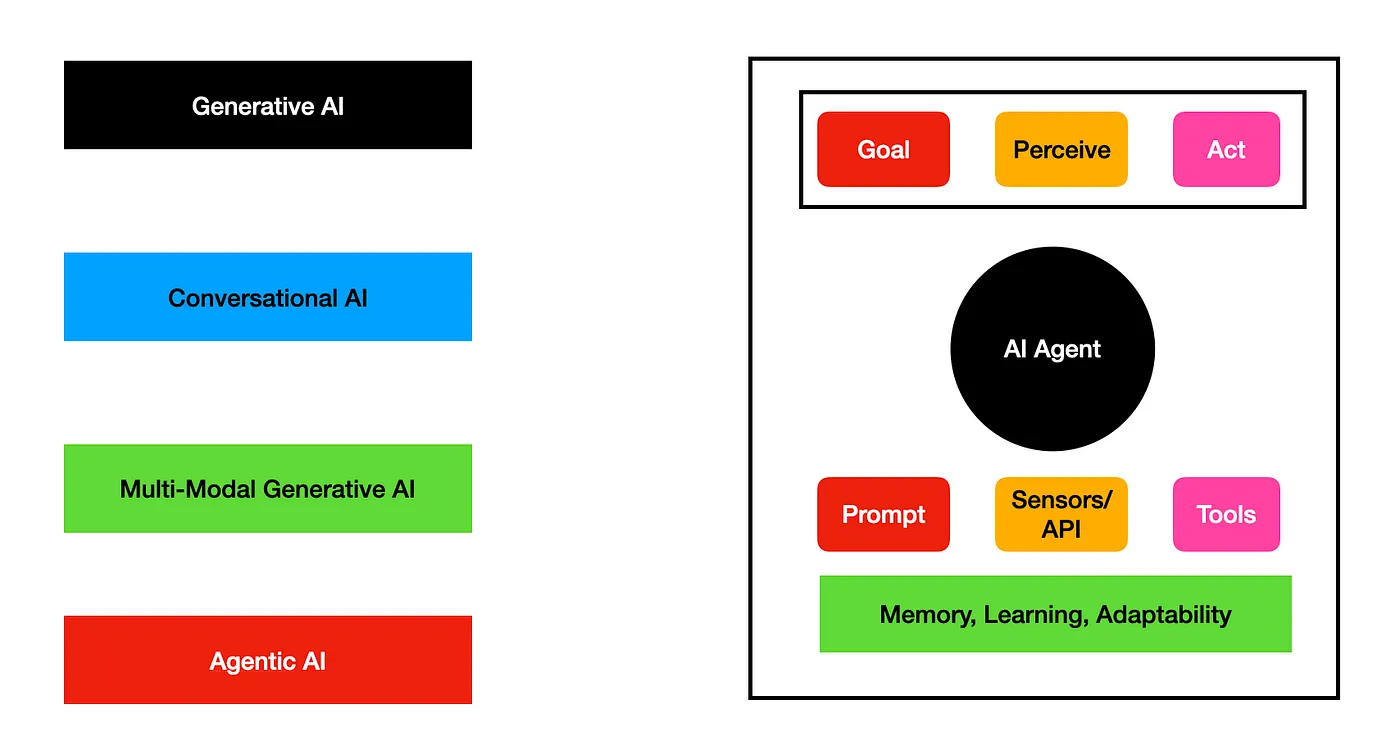 上图展示了AI是如何从基本的生成模型进步到更高级的AI代理,能够与各种工具协作。