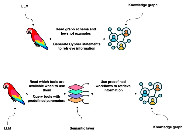 为LLM代理提供一套强大的工具,让它能与图数据库互动知识图谱提供了一种很好的数据表示方式,支持灵活的数据模式,可以存储结构化和非结构化信息。您可以从Neo4j这样的图数据库中检索信息。虽然这种方法提供了很好的灵活性,但是基础大语言模型在生成精确的Cypher语句时仍然存在不稳定和不一致的问题。因此,我们需要寻找替代方案以确保一致性和稳健性。如果大语言模型不是生成Cypher语句,而是从用户输入中提取参数,并根据用户意图使用预定义的功能或Cypher模板会如何?简而言之,您可以为大语言模型提供一组预定义的工具和基于用户输入何时以及如何使用它们的指南,这也就是所谓的语义层。