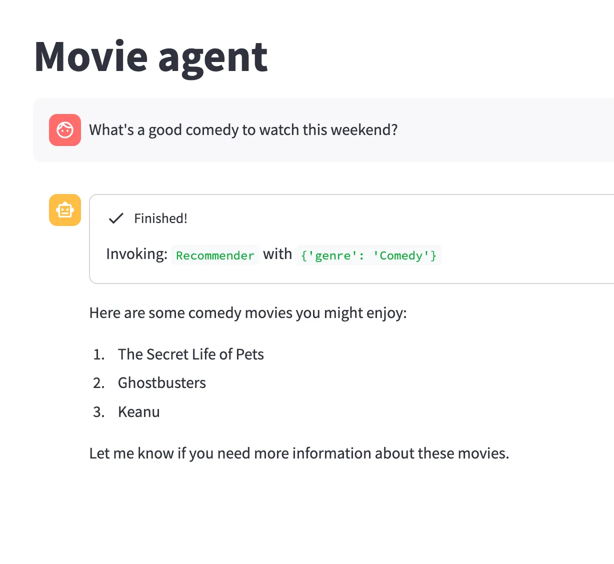 电影代理程序的语义层后端实现已公开提供,并作为一个LangChain 模板提供使用。我用这个模板搭建了一个简单的Streamlit聊天程序。