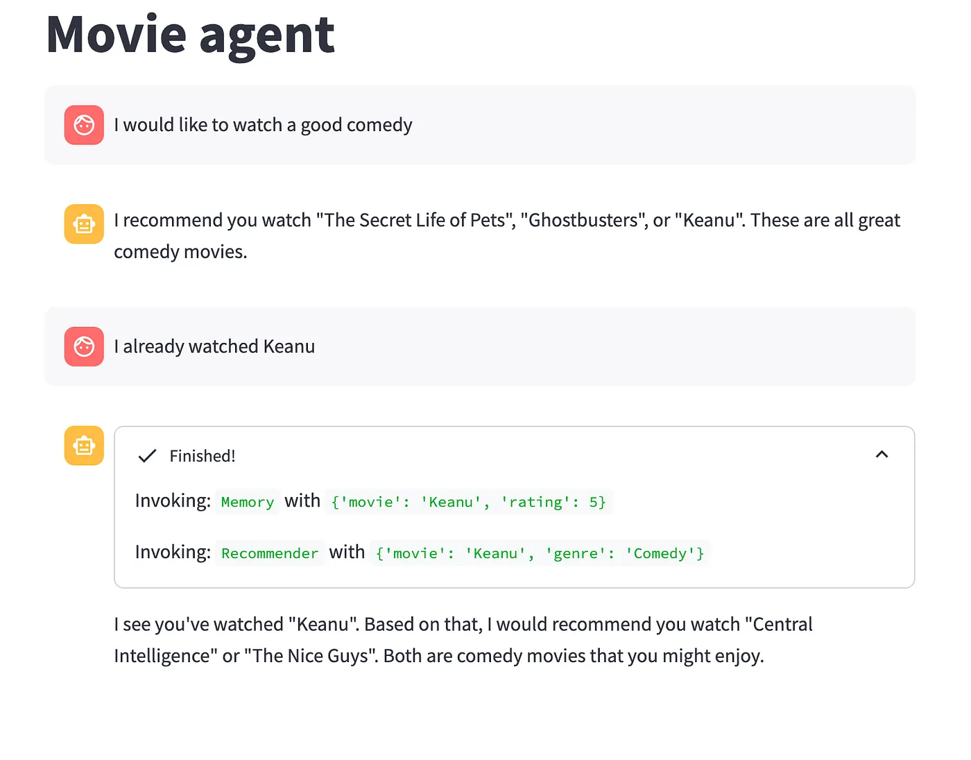 到目前为止,我们已经定义了两种工具来从数据库中获取数据。信息流也可以是双向的。例如,如果用户告知代理他们看过这部电影并且可能喜欢它,我们可以将这些信息存储在数据库中,并在推荐时使用这些信息。这时,记忆工具就显得很有用了。