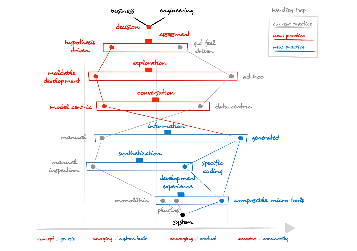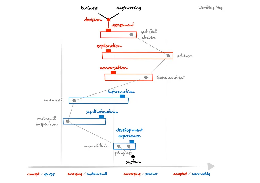 总之,当前的做法可以描述为基于直觉的感觉评估,这种评估是基于即兴探索,建立在被视为“data-centric(数据驱动的)”的对话之上,这些对话是通过手动信息合成的。该过程使用的是通过单一工具开发经验进行的手动审查。我们已更新了Wardley map以反映当前的做法,如图2所示。