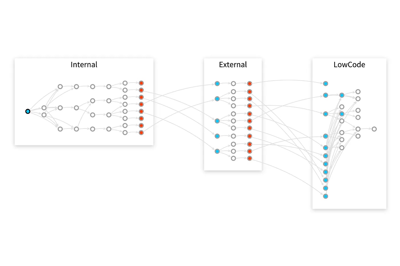 如图6所示,其中一个工具生成的视图展示了这样一个过程:一个单独的输入点(内部的蓝色点)影响了其他多个数据点(内部的红色点)。这些数据点随后成为了外部系统的输入点,并进而影响了更多的数据(外部的红色点)。最终,这些数据点成为了低代码系统中的输入点。