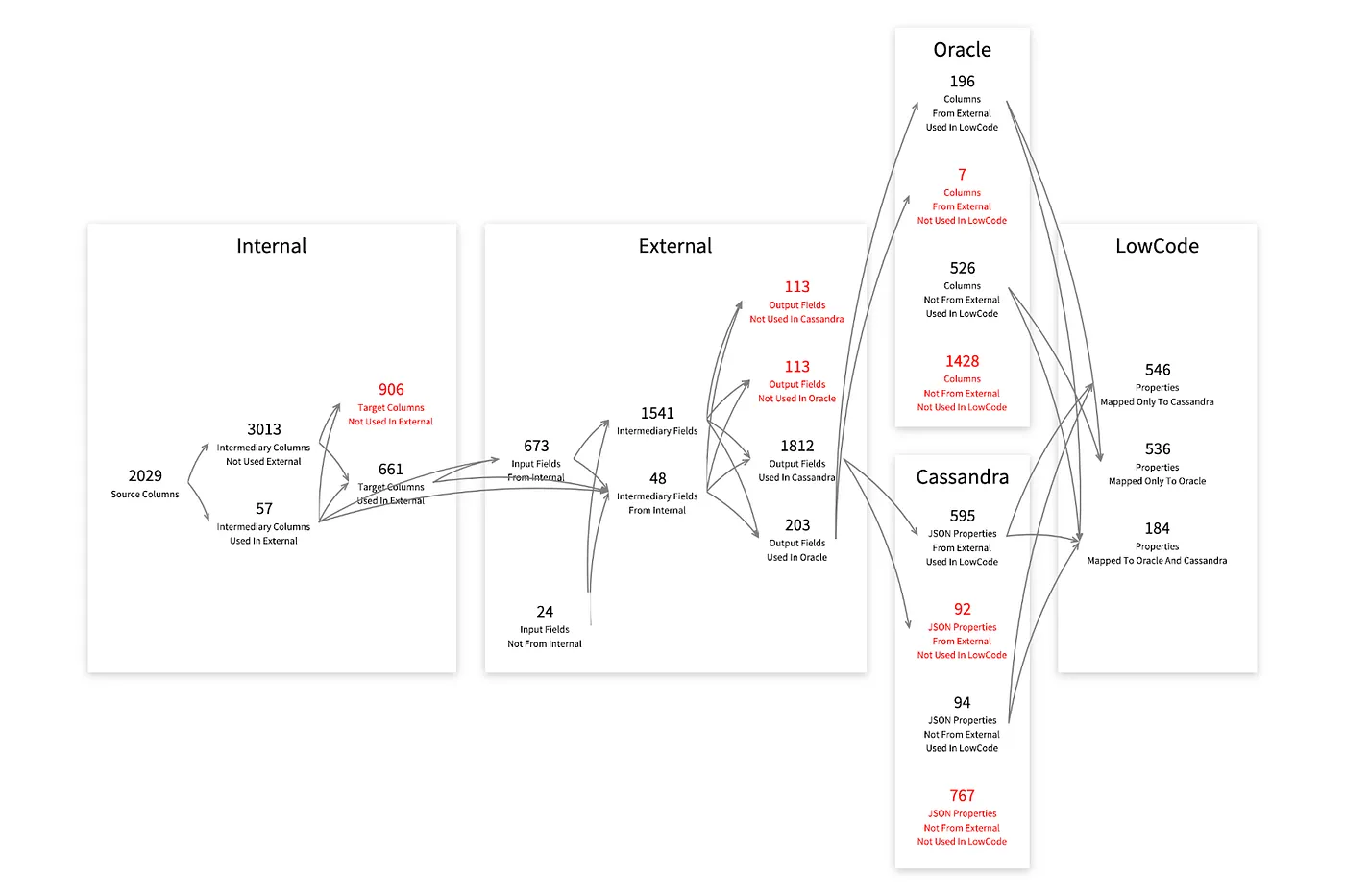 对于每个系统,可视化展示了在其他系统中被使用或未被使用的属性组。红色部分对应于创建但以后未被使用的属性组。本质上,这些是“暗数据”,即未与其他部分互动但增加了系统“负担”的数据。