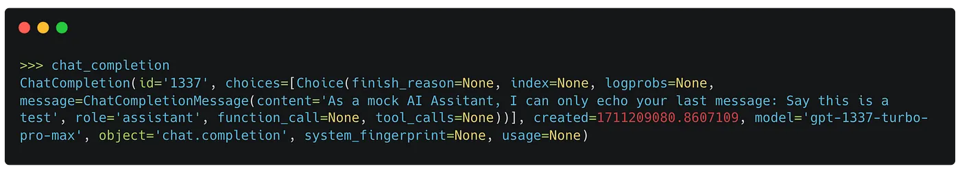 重启 uvicorn 服务器后,我们将启动 Python 命令行,并输入以下代码(如 OpenAI 的库文档所示)。
