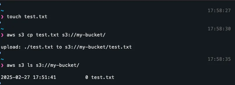 是的,我本应该那样做。如果你在一个不存在的或你没有访问权限的桶里运行 ls 命令,会有错误提示。挺奇怪的。所以我立刻往里面复制一个文件: