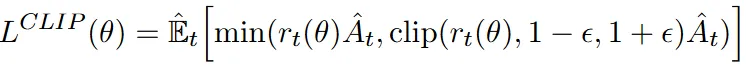 目标函数用于剪裁的替代函数——其中epsilon是超参数(来源参见https://arxiv.org/pdf/1707.06347)