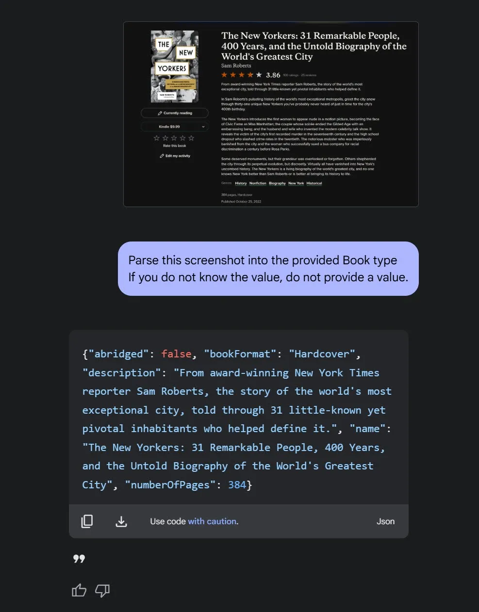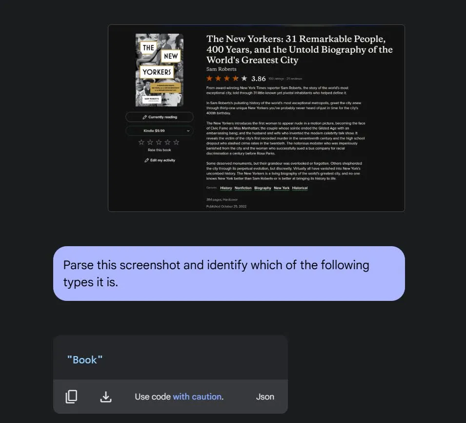 最后,我可以从Goodreads上截图,Gemini能够正确地将截图转换成高质量的JSON数据。
