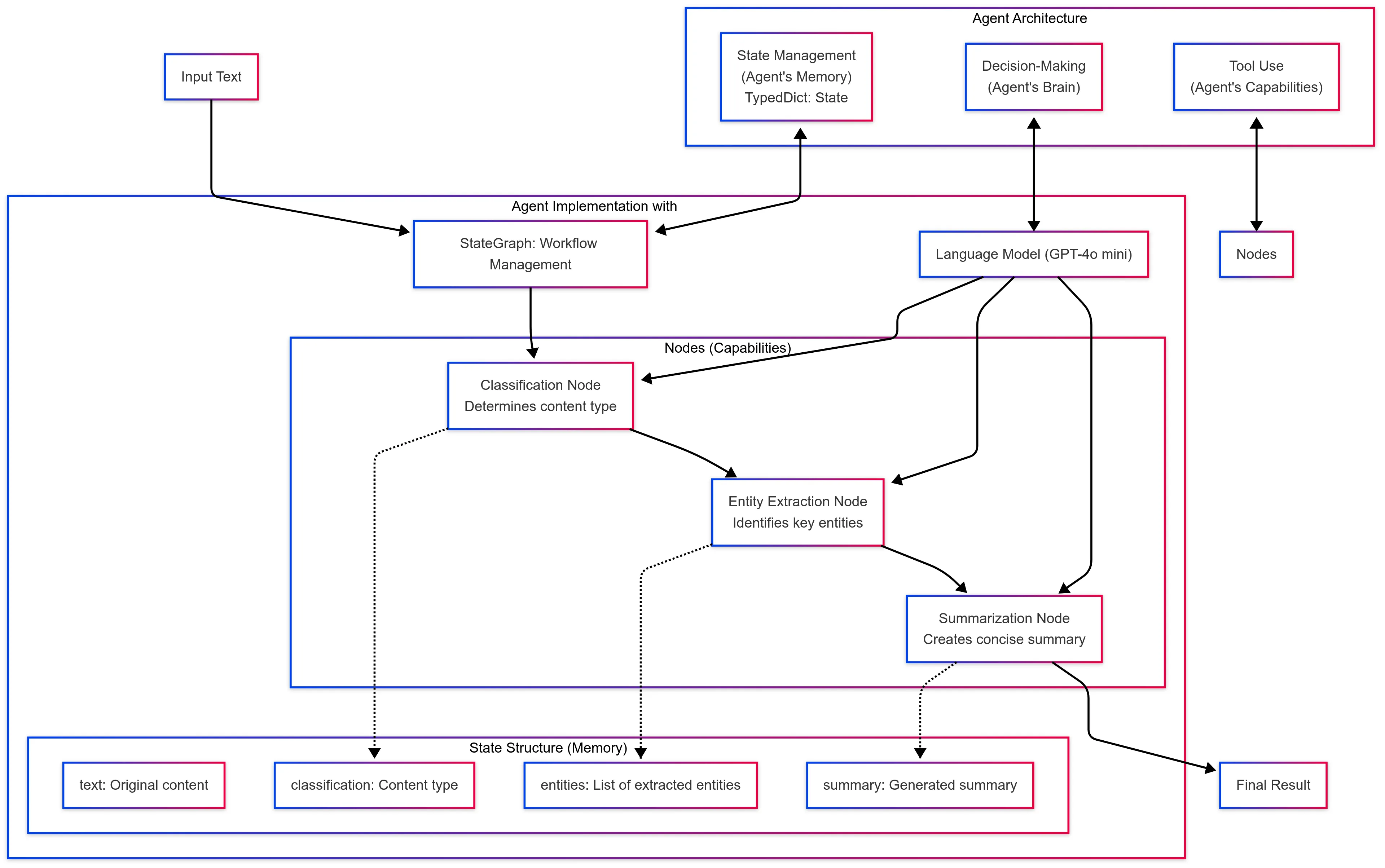 你创建了一个代理,它能够从分类到实体提取再到摘要生成,有序地进行,它能理解文本类型,并识别重要实体,生成摘要内容,最后完成整个流程。