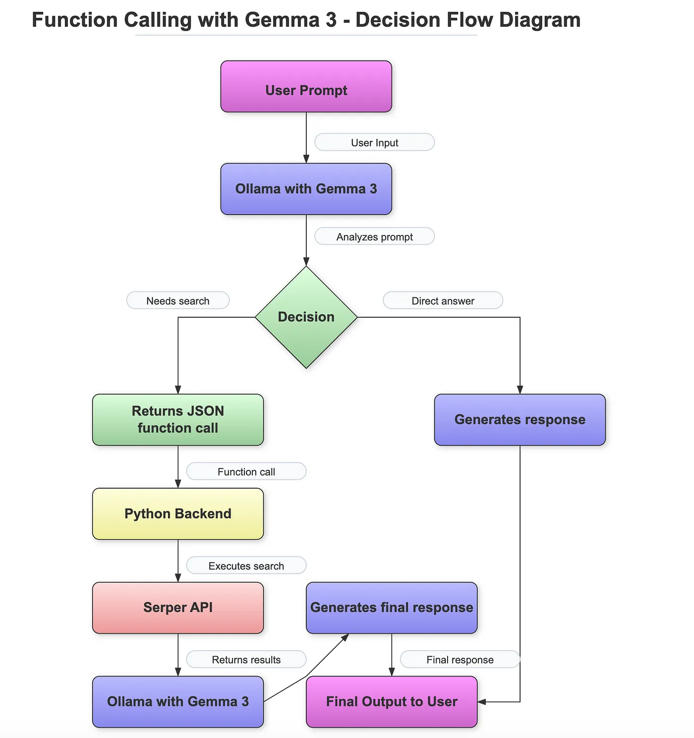 以下决策过程展示了Gemma 3在Ollama上运行会怎样决定直接回应用户的指令或问题,还是触发一个功能调用(比如,像Serper这样的外部API)。