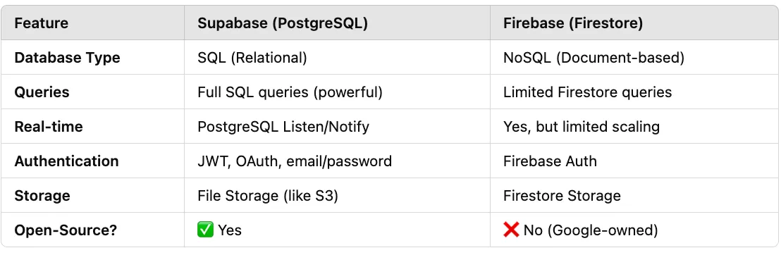 1.1 Supabase 与 Firebase:整体比较✅ 你需要包含关系的数据结构(例如,用户和帖子)。
