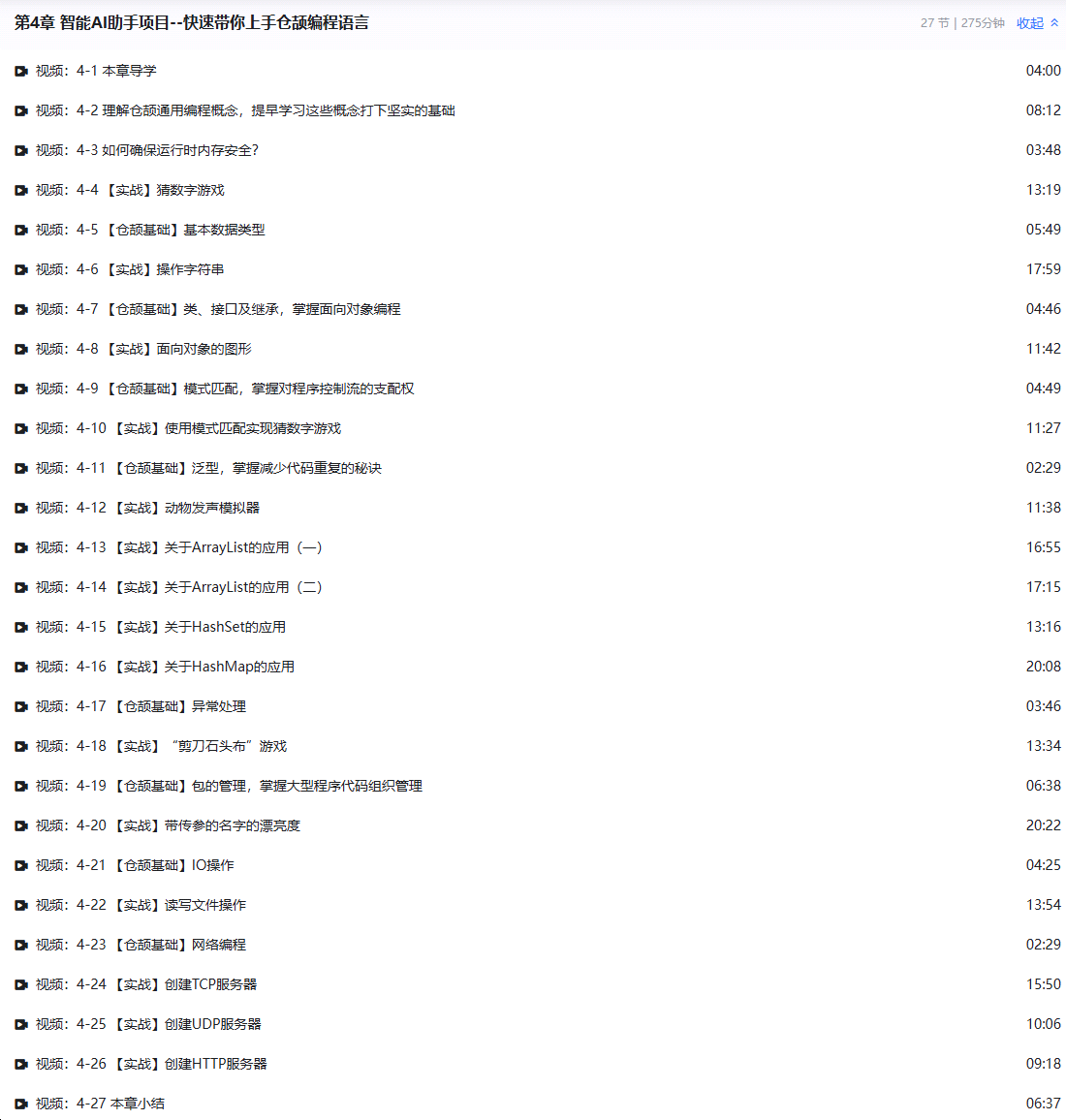 - 学习成本:由于仓颉编程语言相对小众,资料和教程有限,自主学习难度较大。如果时间有限,可能难以在规定时间内掌握并完成毕业设计。这里推荐参加视频课程,由专业讲师全程面向0基础讲解,从0到1带领学员快速掌握仓颉编程语言。另外,本课程安排了华为仓颉编程语言入门课程“第4章 智能AI助手项目–快速带你上手仓颉编程语言”,整整有275分钟时长,相信学完这章,便能完全掌握仓颉编程语言的核心语法及常用API了。