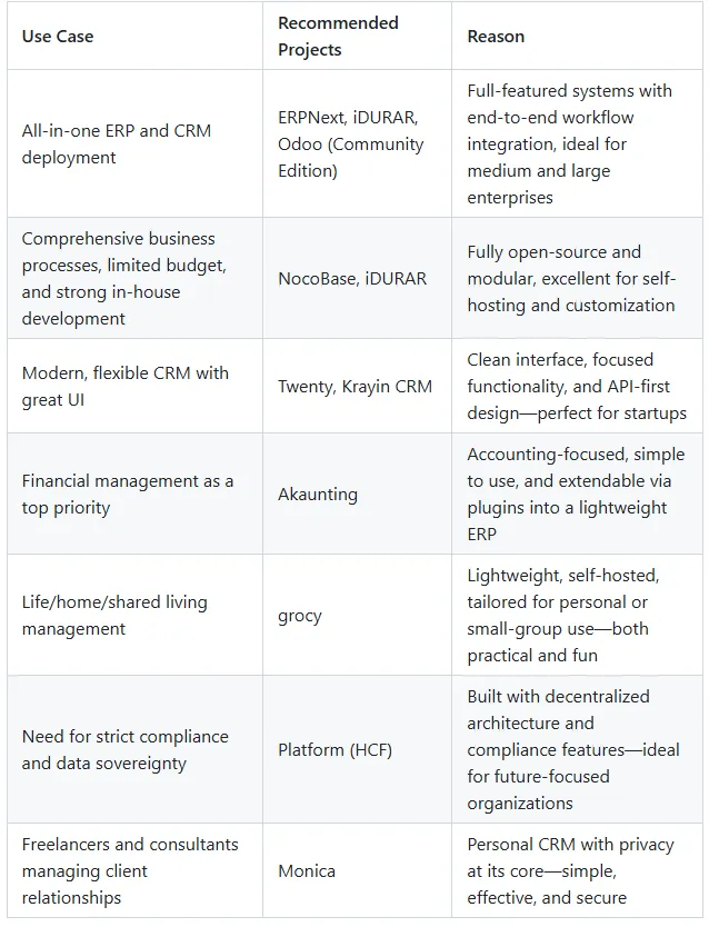 看过这么多选项后,选择最适合您企业的开源ERP/CRM系统可能很困难。每个项目都有其优势,但关键是找到与您的目标最契合的那个。这里有一个快速对比表,帮助您根据常见情况做出选择: