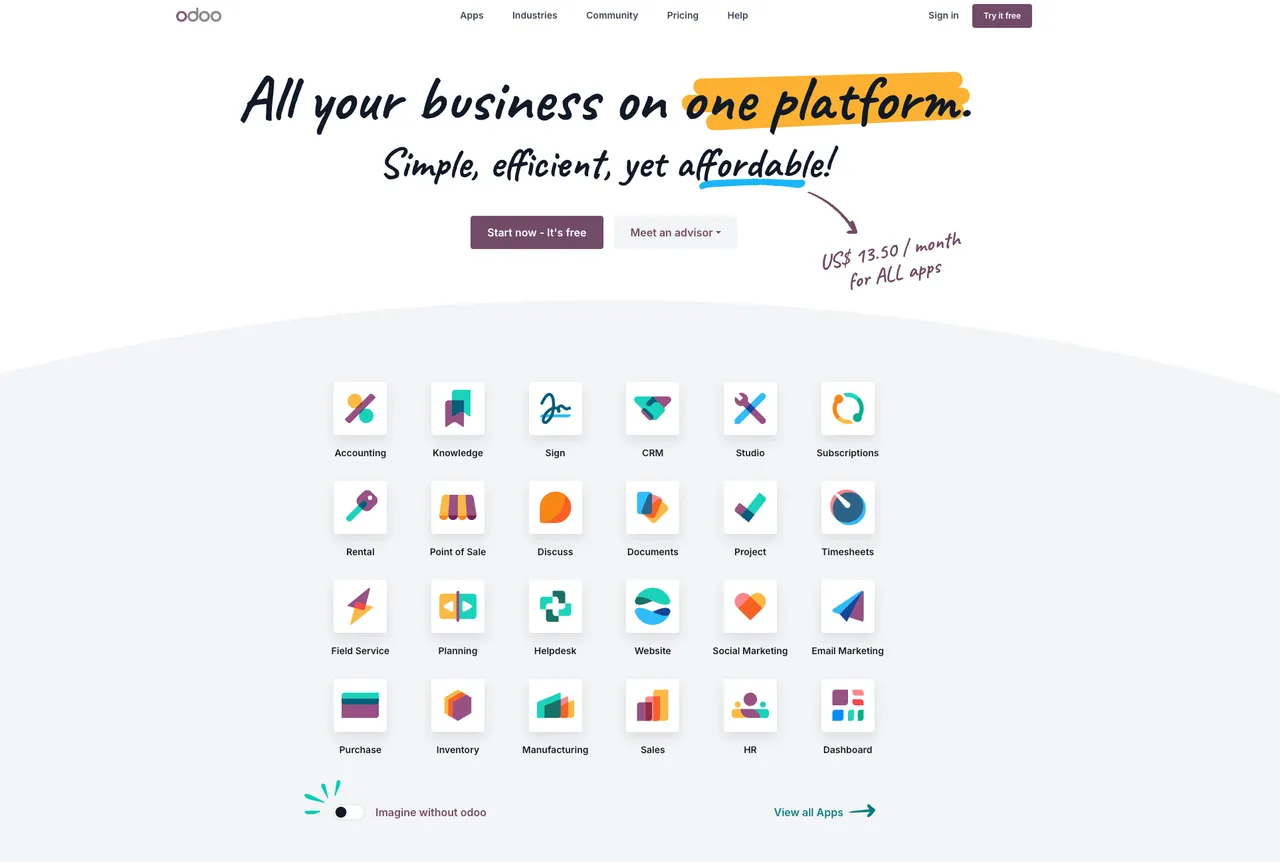 最初在2005年以OpenERP的名字推出,Odoo已经成为世界上最知名和广泛使用的开源ERP/CRM解决方案之一。Odoo既模块化又完全集成的架构能够处理几乎所有关键的业务流程,包括销售、采购、库存管理、财务管理、制造、项目管理、人力资源、市场和电商。