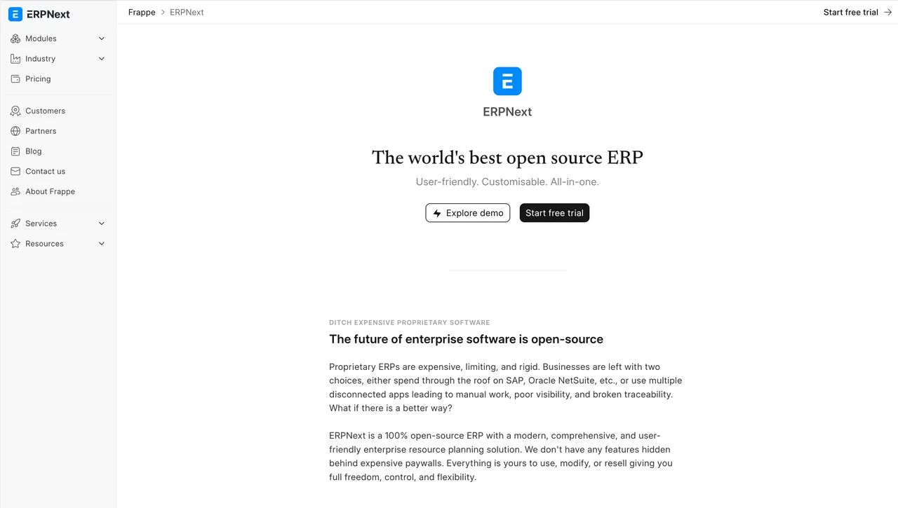 ERPNext,由印度公司Frappe开发并于2011年开源发布,是世界上最为活跃和受尊敬的开源ERP平台之一。ERPNext基于自家开发的Frappe框架(Python、MariaDB/MySQL后端以及JavaScript/React前端)构建,提供了即用性和强大的定制能力。