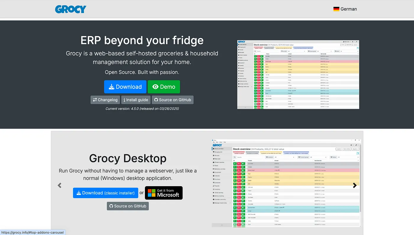 最初专注于家庭食品库存的管理,grocy现已扩展,包括购物清单、食谱、家务事、设备维护计划以及开销追踪等功能。本质上来说,grocy相当于一个小型ERP系统,还集成了基本的客户关系管理(CRM)、库存管理和资产管理功能,让用户可以通过网页或移动设备管理所有家庭和生活相关任务。
