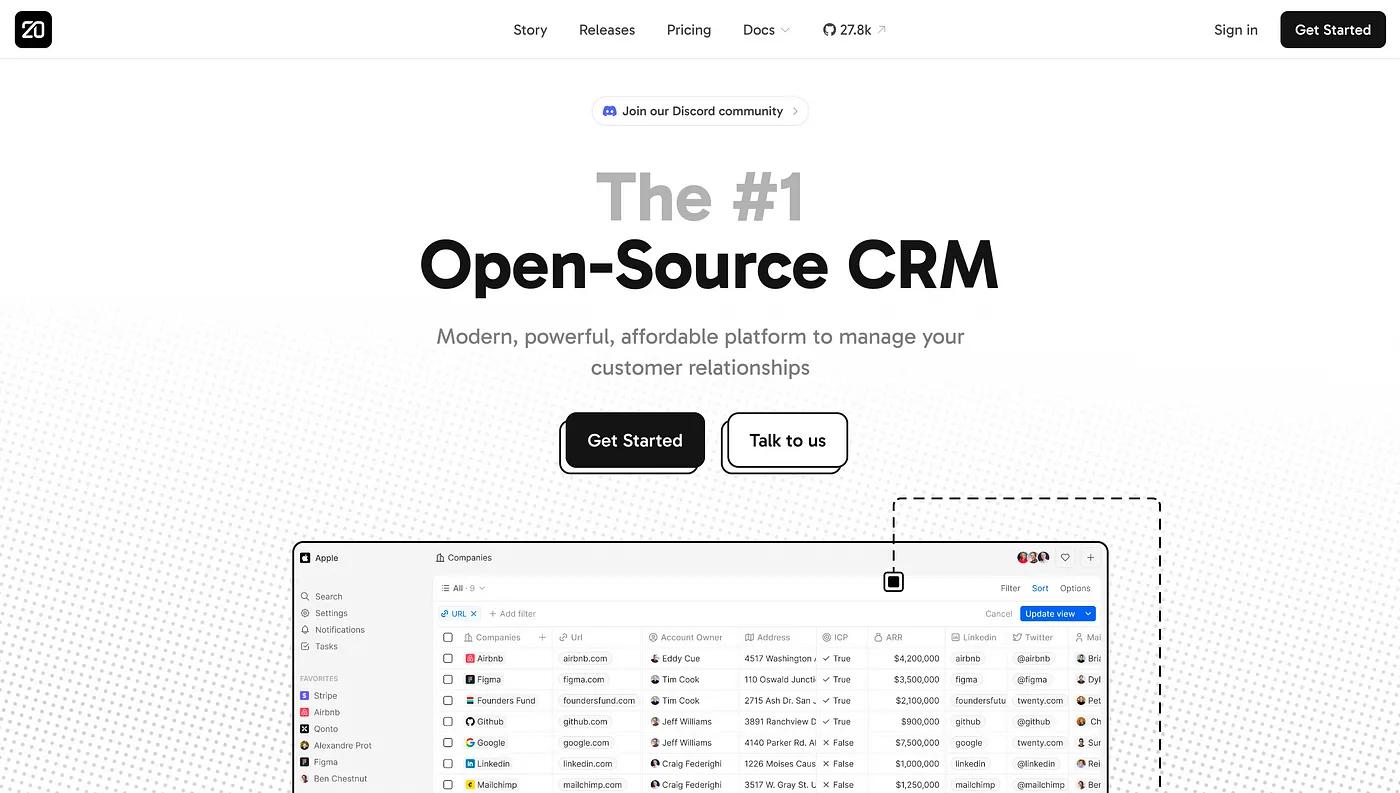 Twenty是一款简洁而现代的开源CRM(客户关系管理系统),设计为中心简洁性、协作性和定制性。采用Node.js、React和PostgreSQL技术,Twenty涵盖了潜在客户(潜在顾客)、客户管理、联系人和合同跟踪等主要功能。