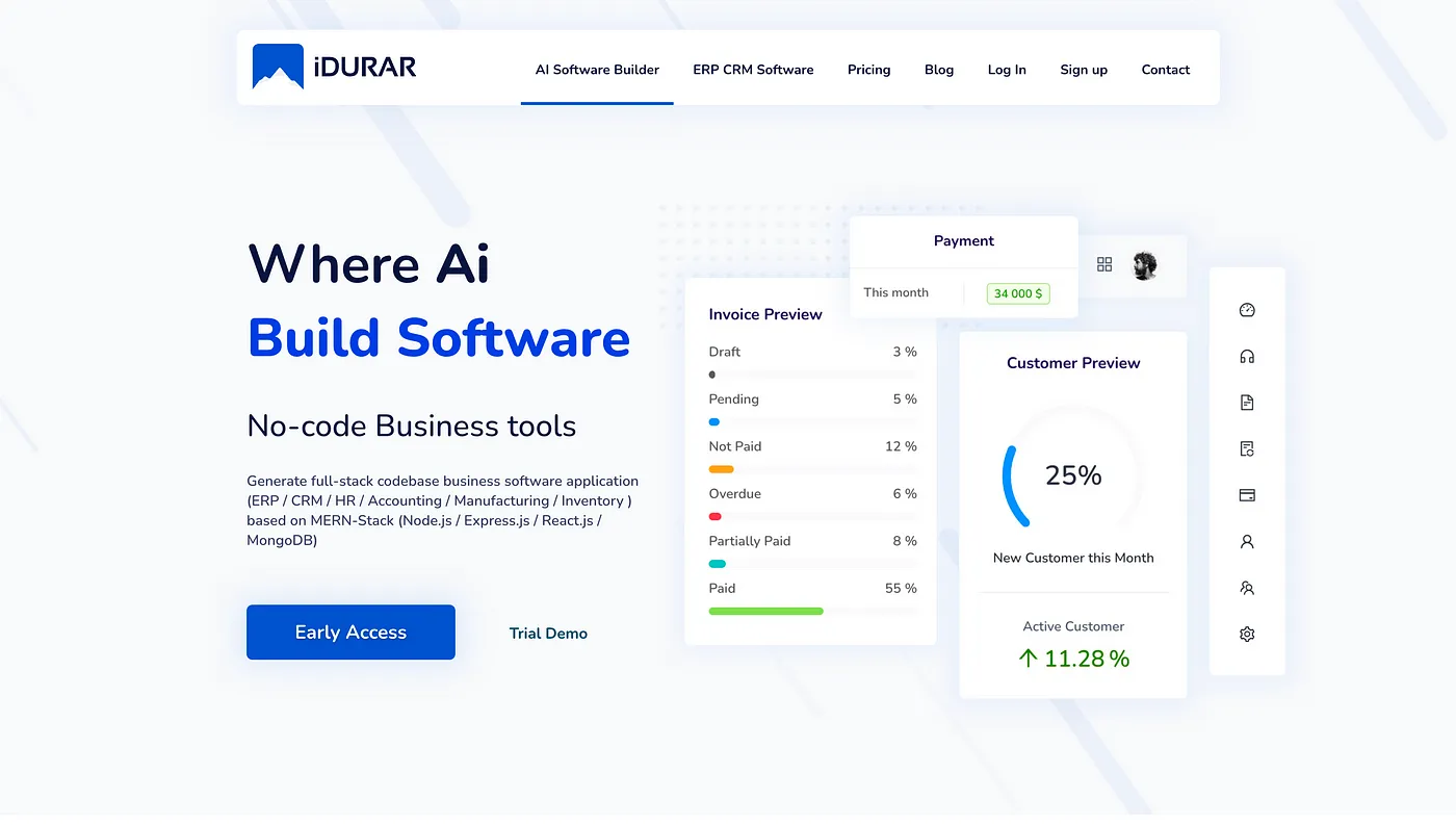 iDURAR 是一款现代开源的 ERP 和 CRM 平台,专为小型和中型企业的打造。它提供了一站式的解决方案,通过统一的界面管理客户、销售、采购、库存、项目和财务管理。