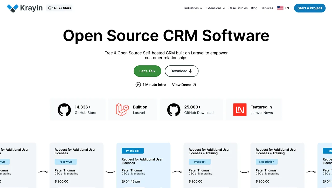 Krayin CRM 是一个基于 Laravel 框架的现代开源 CRM 系统,由 Bagisto(一个流行的开源电商平台)背后的团队开发。Krayin 于 2021 年 开源发布,旨在为中小型企业及初创企业提供一个免费、用户友好的且易于扩展的 CRM 解决方案。