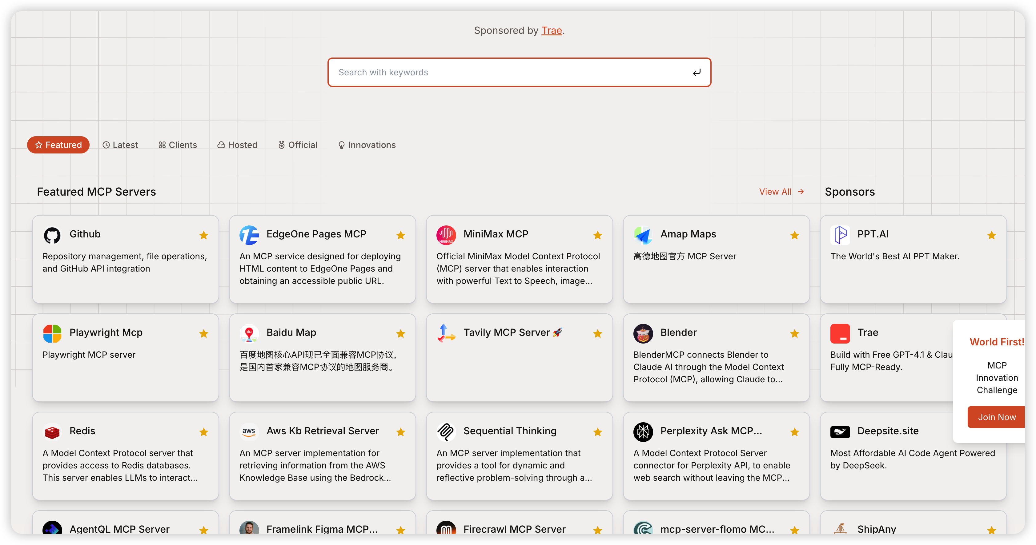 大模型应用可以使用别人分享的 MCP 服务来完成各种各样的工作内容,你可以从这些地方获取 MCP 服务: