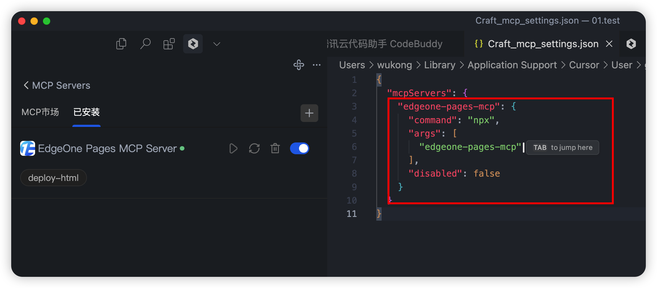 然后在 MCP Server 中添加 EdgeOne Pages MCP Server