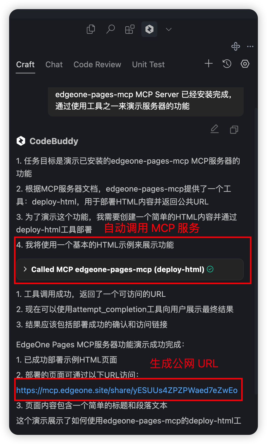 MCP 是一种标准化协议,用于连接 AI 应用和外部工具或数据源。通过接入 EdgeOne Pages MCP Server,CodeBuddy 可以快速将 HTML 内容部署到公网上并生成公网 URL,极大简化了静态网页的开发和部署流程。