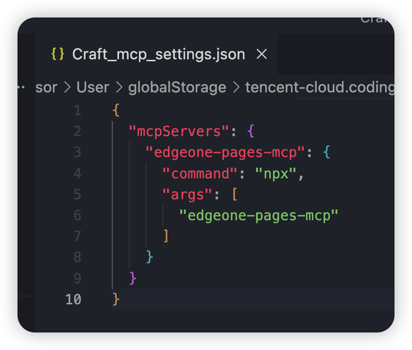 安装完成后,会在一个 Json 配置文件中生成 EdgeOne Page MCP Server 的配置。