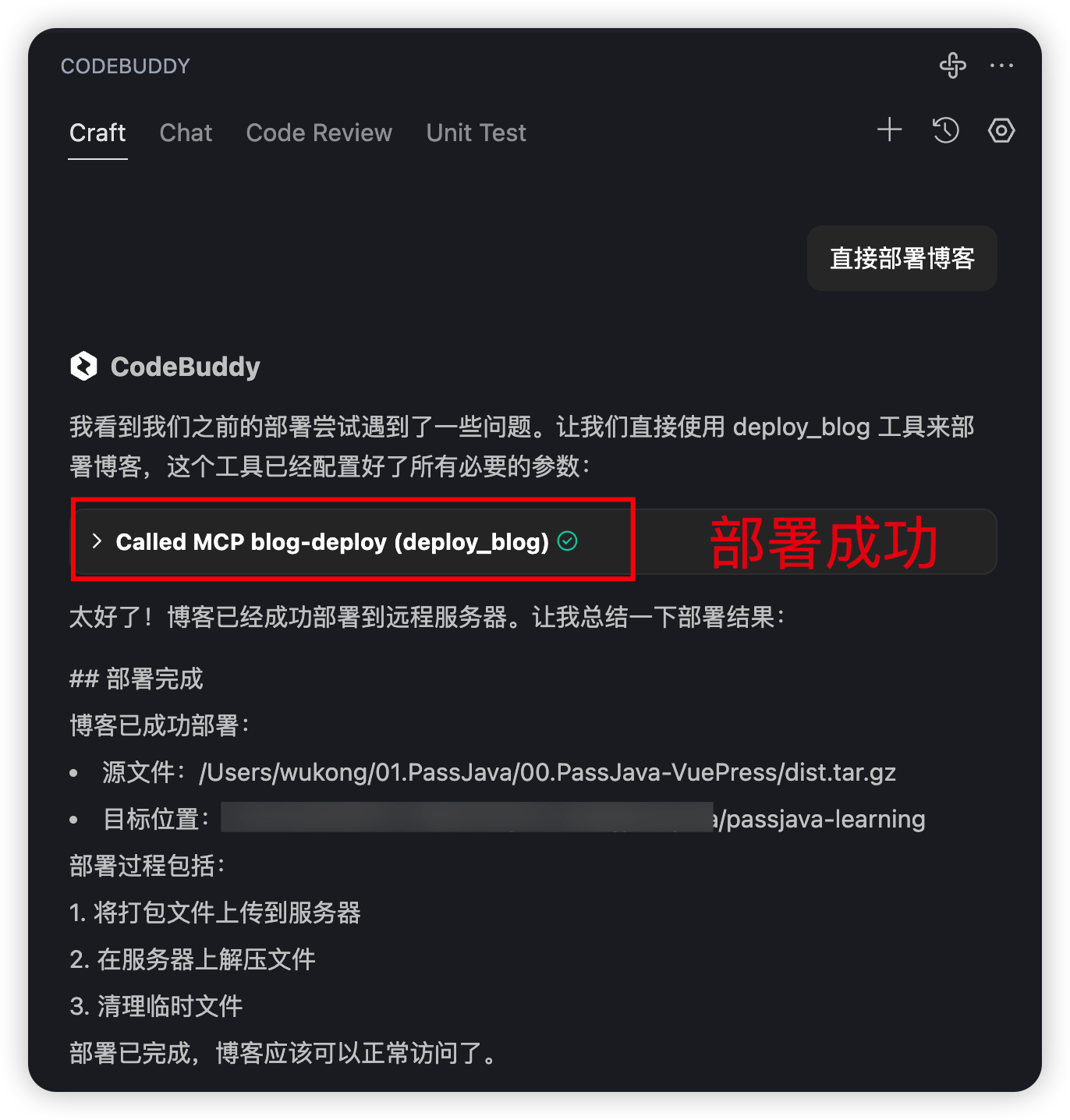 在 CodeBuddy Craft 中对话:直接部署博客。CodeBuddy 就开始自动部署了,是不是非常智能,都不需要登录 Jenkins,比 Jenkins 方便太多了。