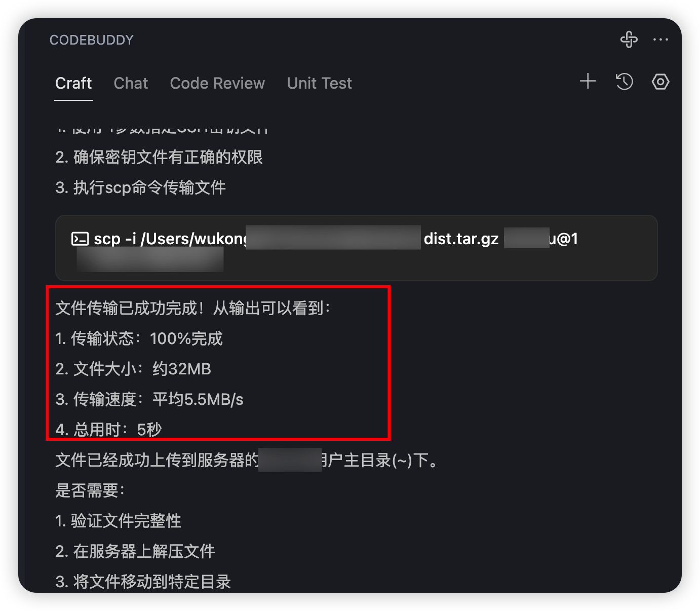 没关系,我们把服务器的信息都发给 CodeBuddy 就行,即使是密钥文件,我们告诉它密钥文件路径就行,它就会自己去本地磁盘去找。然后它就会执行上传操作了,如下图所示,dist.gz.tar 文件上传成功了