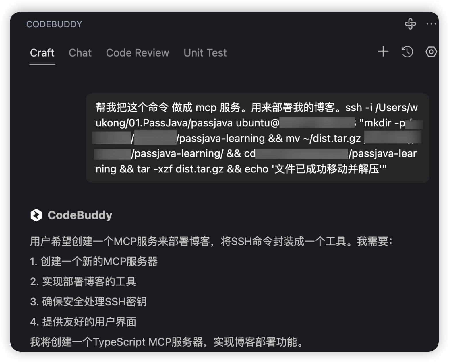 提示语如下图所示,就是让 CodeBuddy 根据这个命令来做成 MCP Server,作用是用来部署我的博客。