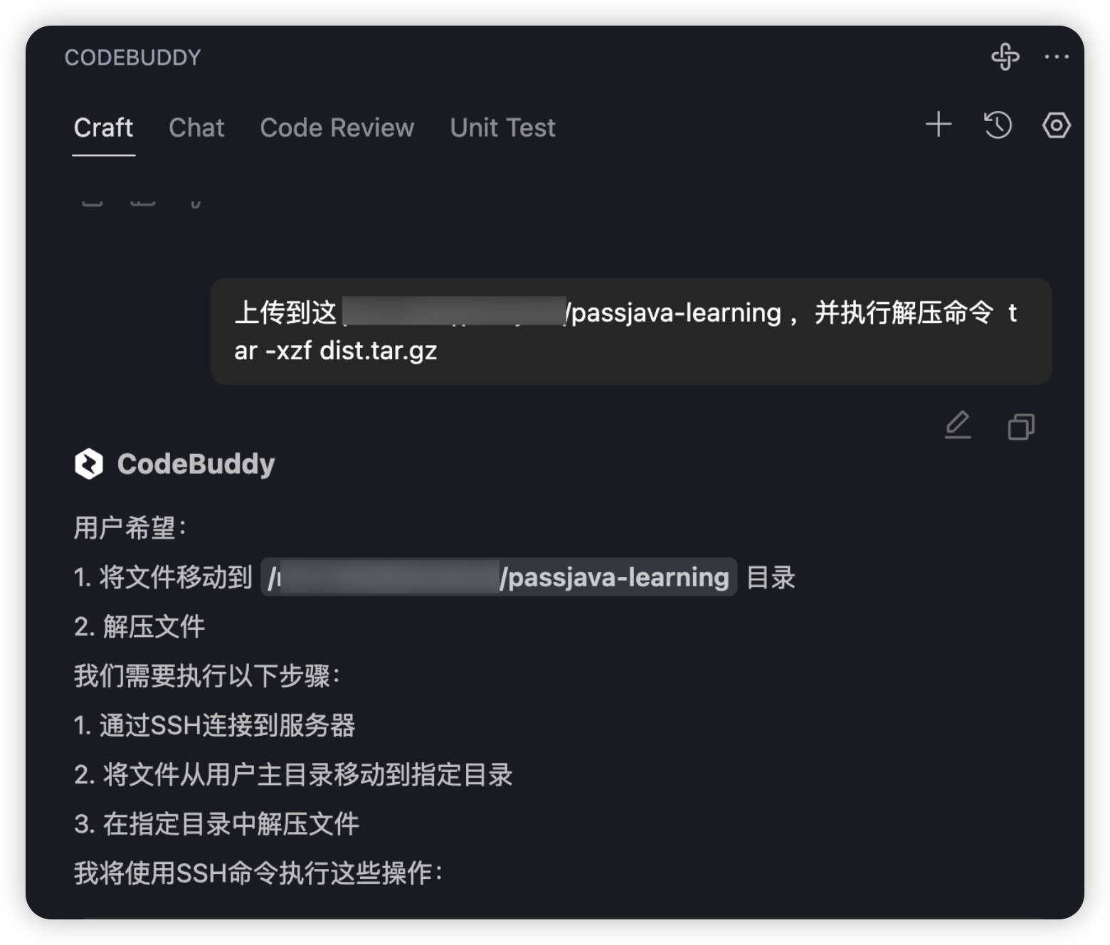接着我告诉 CodeBuddy 上传到这里,然后执行解压命令:
