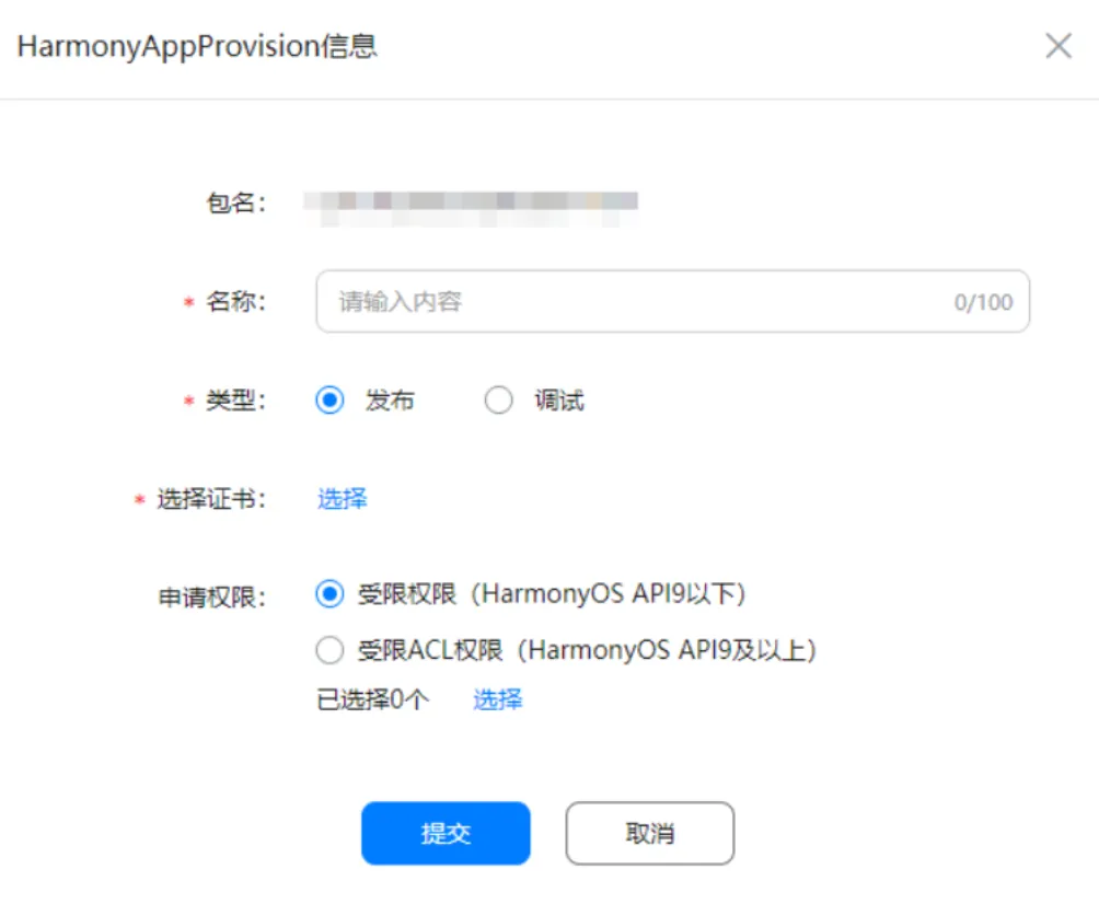 1. 在“HarmonyAppProvision信息”界面填写相关信息,点击“提交”。