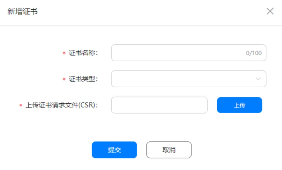 1. 在弹出“新增证书”界面填写相关信息后,点击“提交”。