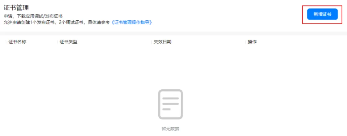2. 左侧导航栏选择“证书管理”,进入“证书管理”页面,点击“新增证书”。